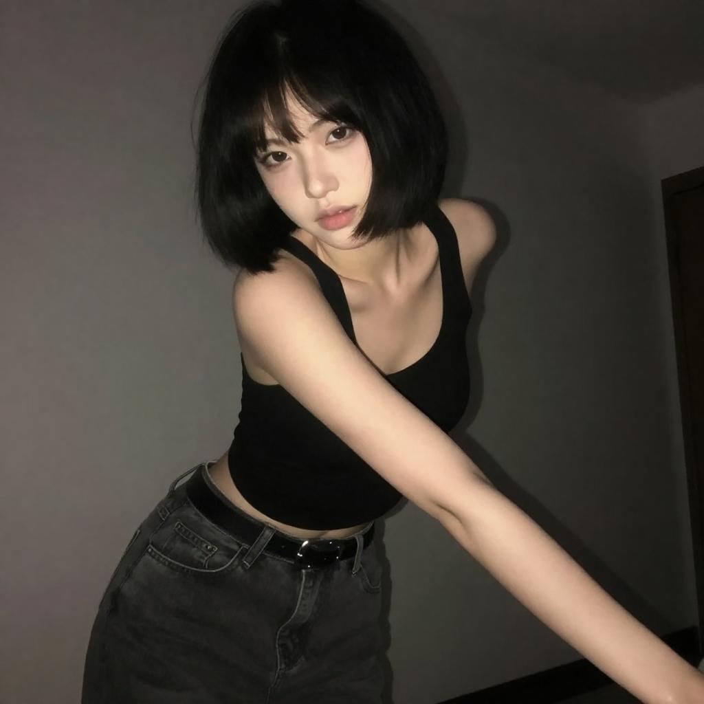 Photograph of a young woman with a short black bob haircut, wearing a black tank top and high-waisted gray pants. She has light skin, an intense expression, and is leaning forward with her right arm extended. Dimly lit background with a faintly visible wall. Her left arm is slightly behind her, and she wears a belt with a silver buckle.