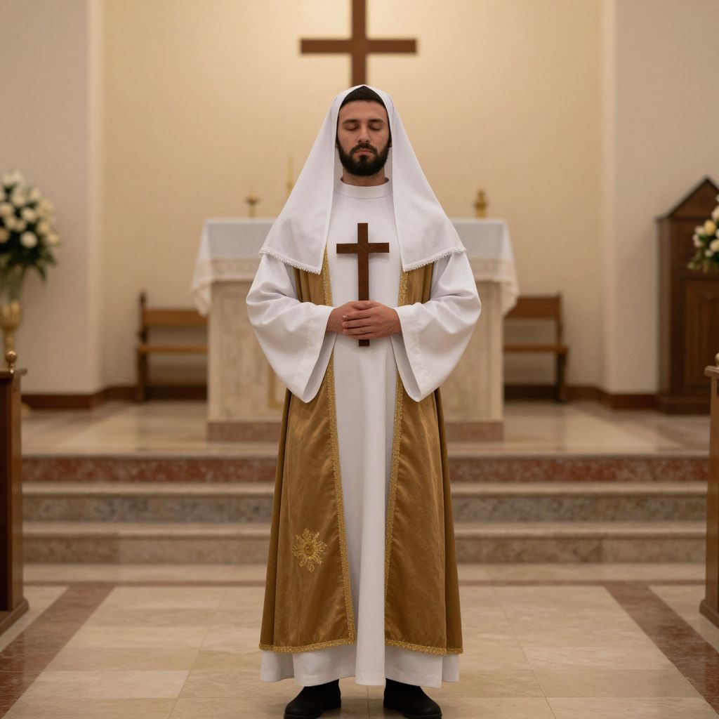 Church costume, 1boy, male focus, beard, facial hair, solo, church, cross, full body, standing, veil, facing viewer, blurry, closed eyes