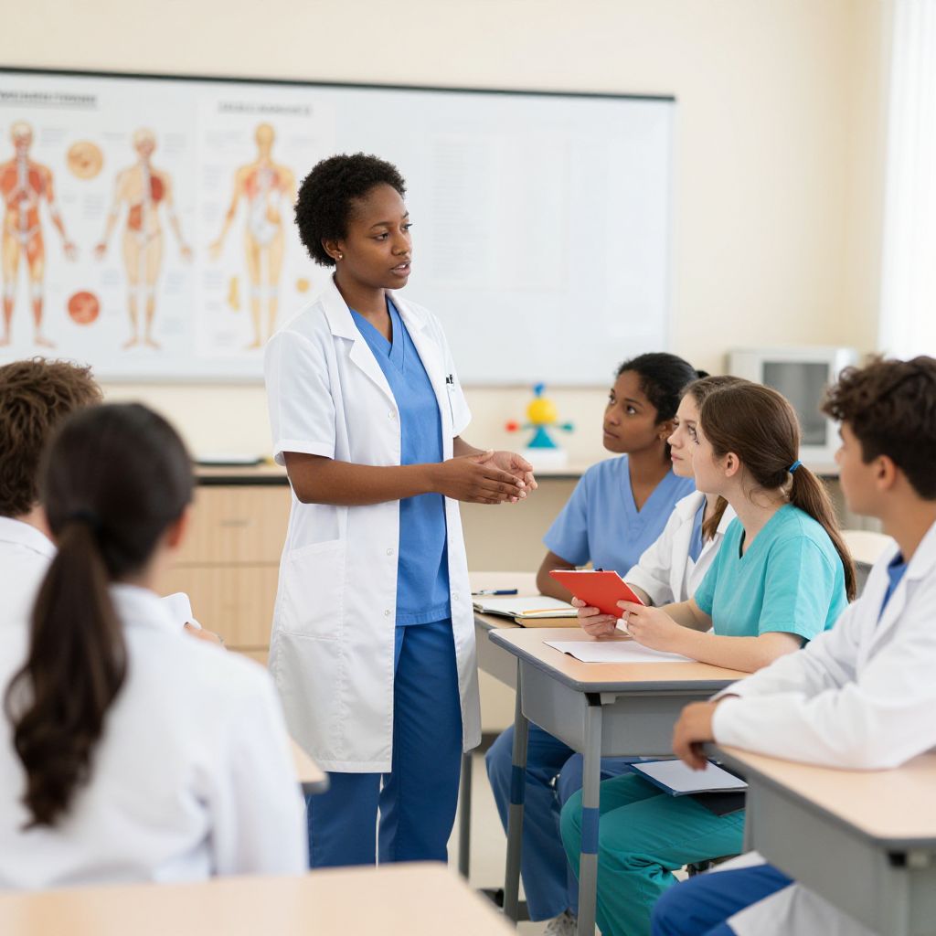 Infermiera teaching medical students in classroom setting, white coats and scrubs, anatomical charts and models in background, bright academic environment, vibrant colors, detailed character expressions showing engagement and knowledge sharing.