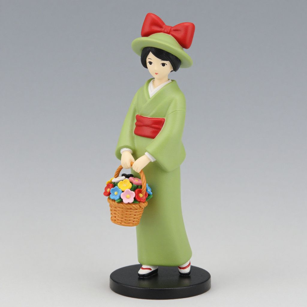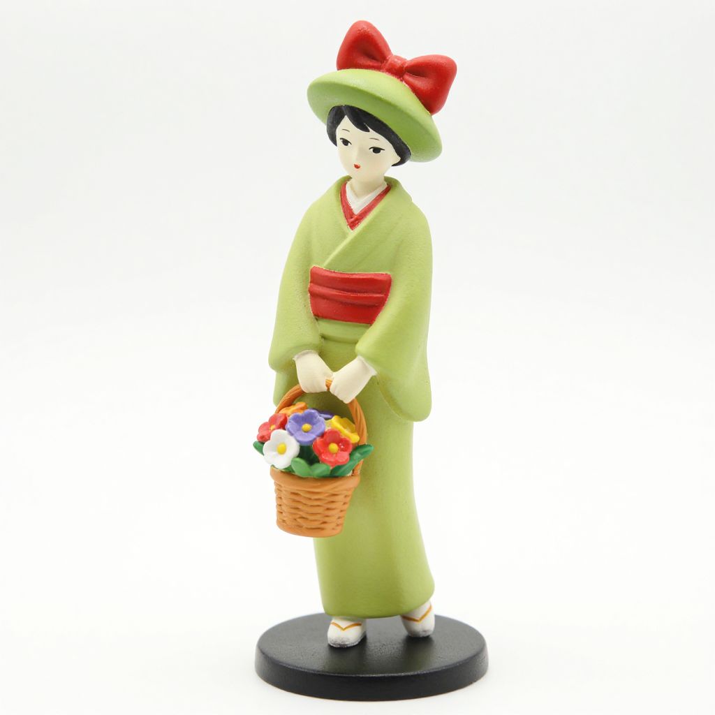 Photograph of a small, colorful figurine of a Japanese woman in a green kimono with red obi, holding a flower basket, standing on