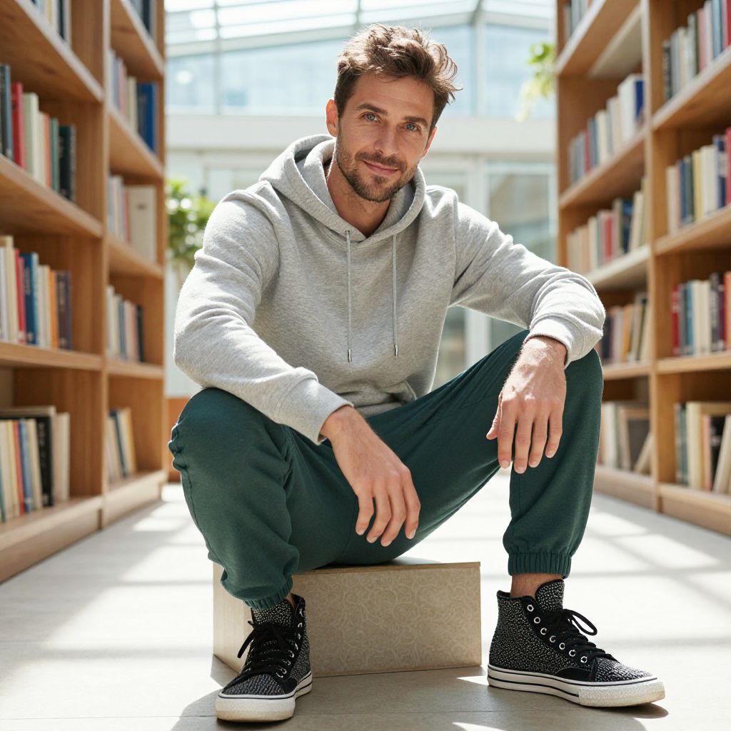 A man, wearing a heather gray hoodie, dark green jogger pants, black high-top sneakers, cozy knit fabric, laid-back vibe, sunlit atrium, shelves of books, modern glass architecture, warm smile, relaxed expression. Man has masculine face and piercing eyes