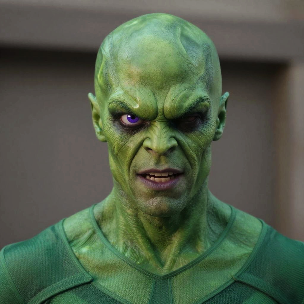 Raimi Green Goblin, a close up of a man in a green costume with a purple eye