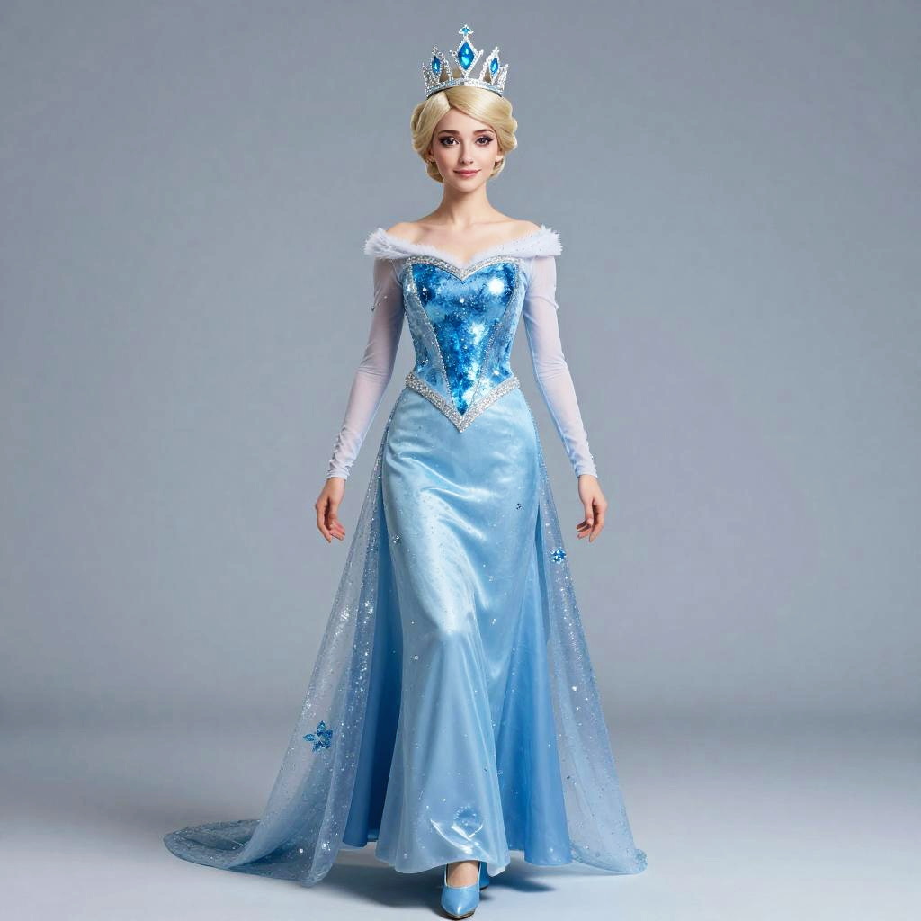 Portrait of a woman wearing a blue ice princess costume featuring a shimmering off-shoulder gown with sequins, sheer long sleeves, and a flowing cape adorned with star patterns. She is also wearing a silver crown with blue gemstones, styled with blonde hair in an elegant updo. The background is plain gray.