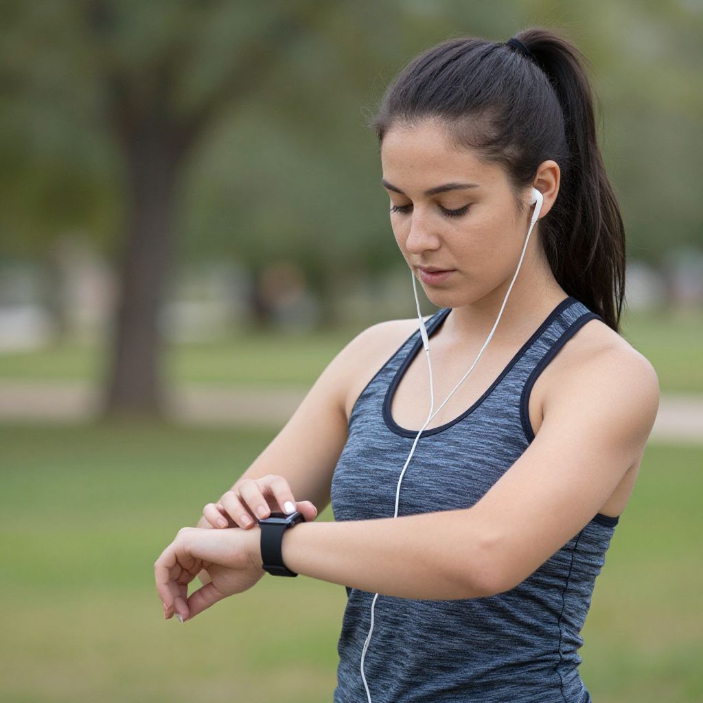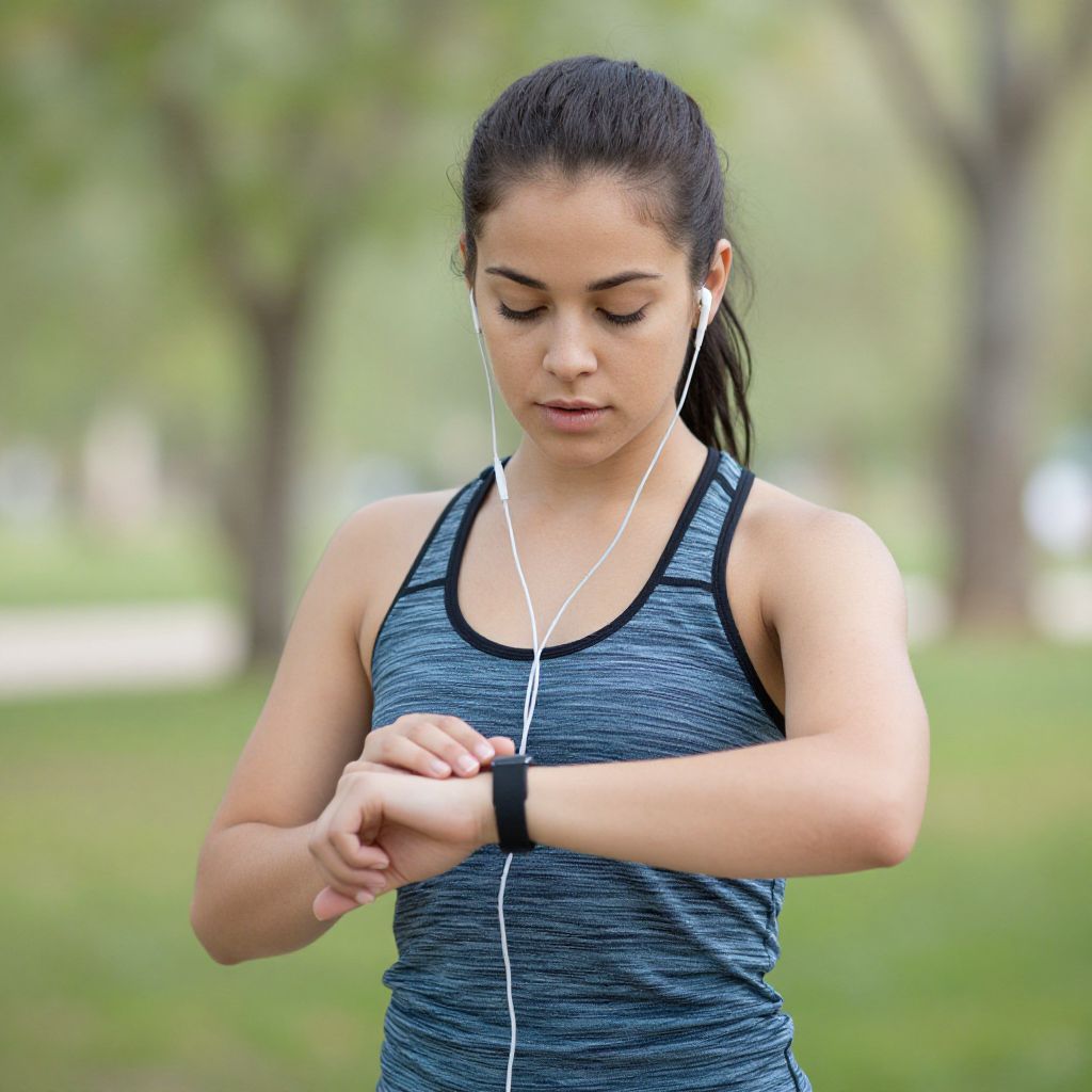 Photograph of a young woman with dark hair in a ponytail, wearing a blue athletic tank top and white earbuds, adjusting her wristwatch
