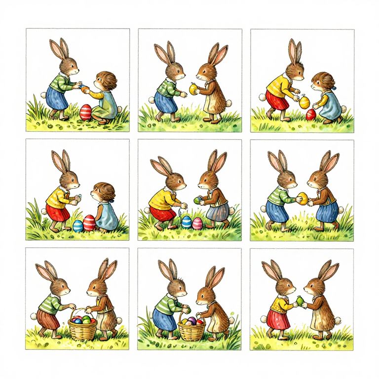 Illustration of nine comic-style panels showing two anthropomorphic rabbits in colorful clothes exchanging Easter eggs and baskets in a grassy field.