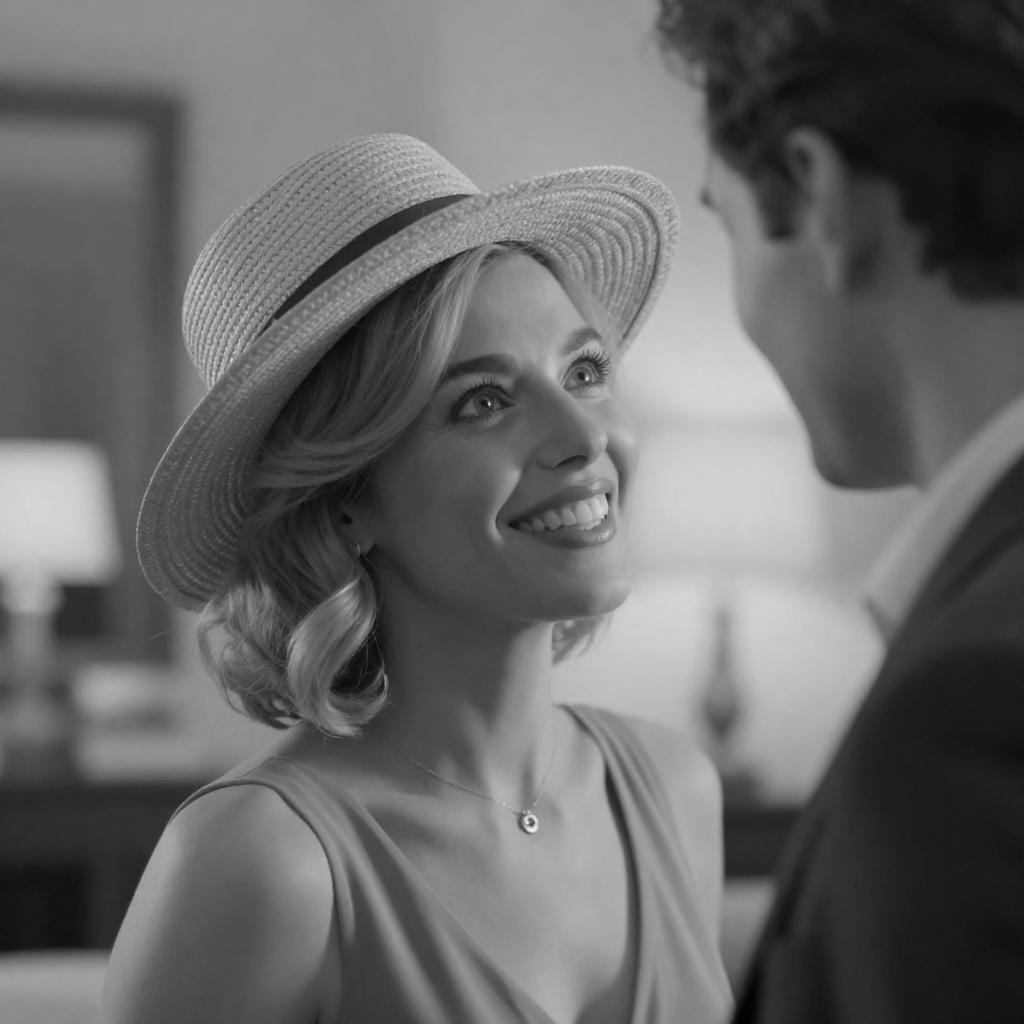 Black and white photograph of a man and woman in a convertible car. Man with dark hair, light shirt, serious expression, driving. Woman with blonde curls, light dress, smiling, holding steering wheel. Road ahead, trees on sides.