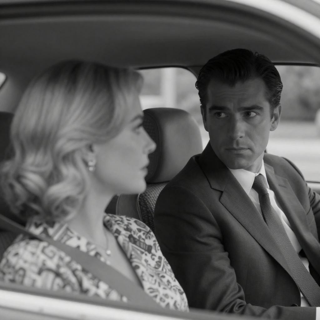 Black and white photograph of a man and woman seated in a convertible car. The man has dark hair, wears a light-colored shirt, and has a serious expression while driving. The woman has blonde curly hair, wears a light-colored, possibly sparkly dress, and smiles while holding the steering wheel. They are on a road surrounded by trees.