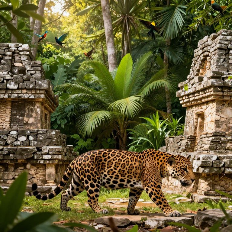 Mayas wildlife scene featuring jaguar prowling near ancient stone ruins, vibrant tropical forest setting with dense foliage and exotic birds, warm sunlight filtering through canopy, emphasizing ancient and wild connection, detailed natural textures.