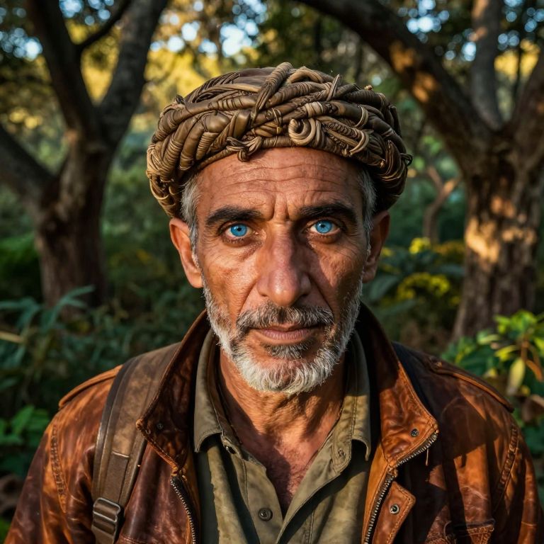 Imagine a photorealistic portrait, captured by an iPhone, of a Middle Eastern explorer with piercing blue eyes that convey both wisdom and resilience. This unique, bird's-eye view emphasizes the rugged yet refined contours of their face, bathed in a soft, golden light filtering through ancient tree canopies. The intricate details of their weathered leather attire, along with the delicate interplay of shadows across their features, evoke a sense of adventurous spirit. The surrounding lush forest creates an emotional gradient, enveloping the subject in tranquility and wonder.