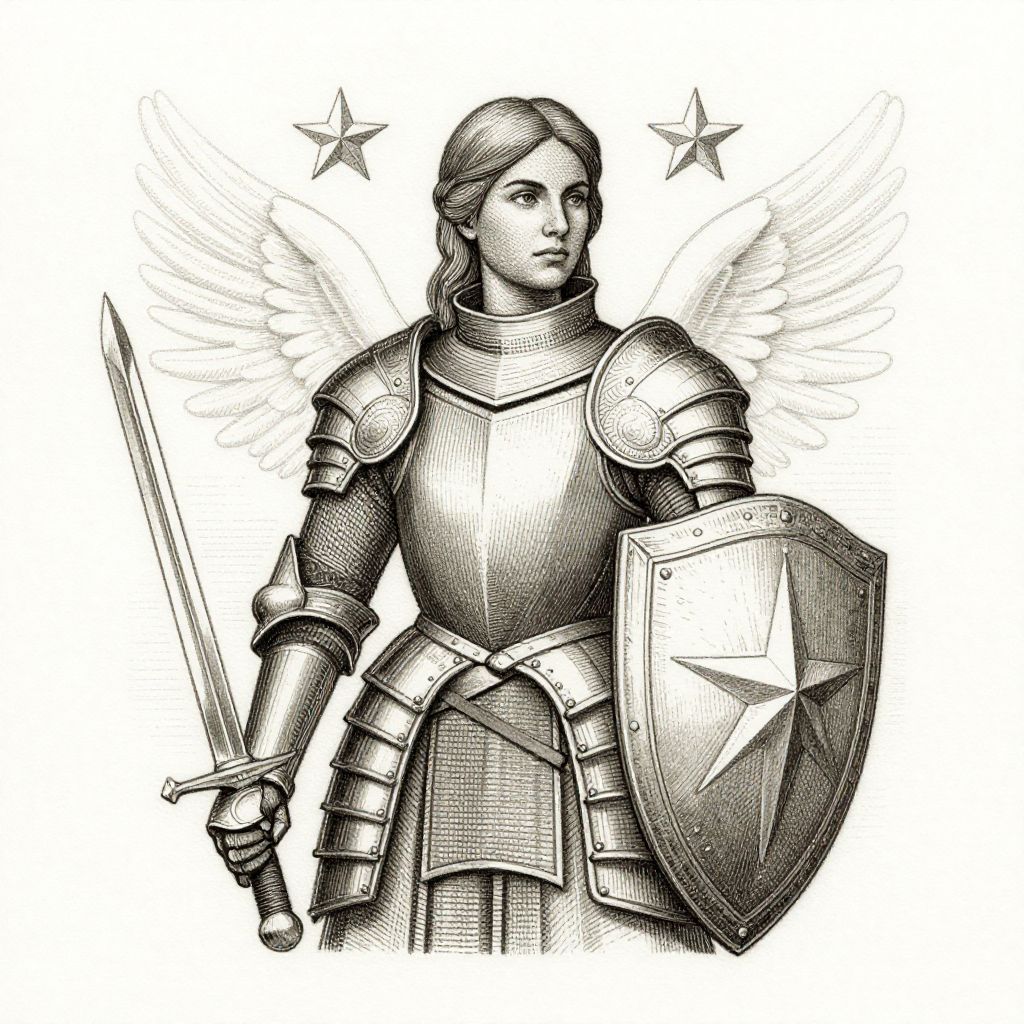 Black-and-white ink drawing of a female angelic knight with wings, wearing armor, holding a sword and shield, stars in background.