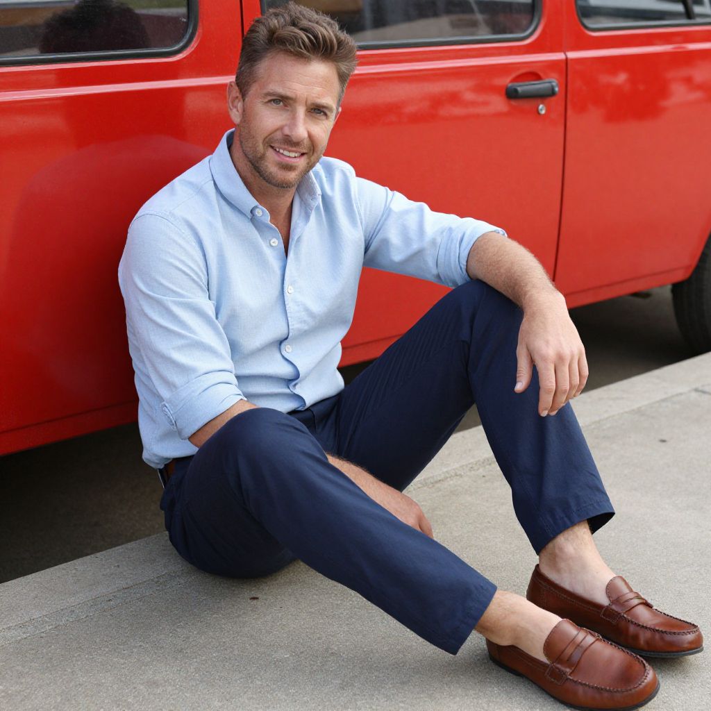 A man, light blue Oxford shirt, navy slim trousers, brown leather loafers, casual elegance, bright red caboose, 3M ferrania analog film stock, relaxed smile, warm sunlight.Man has masculine face and piercing eyes