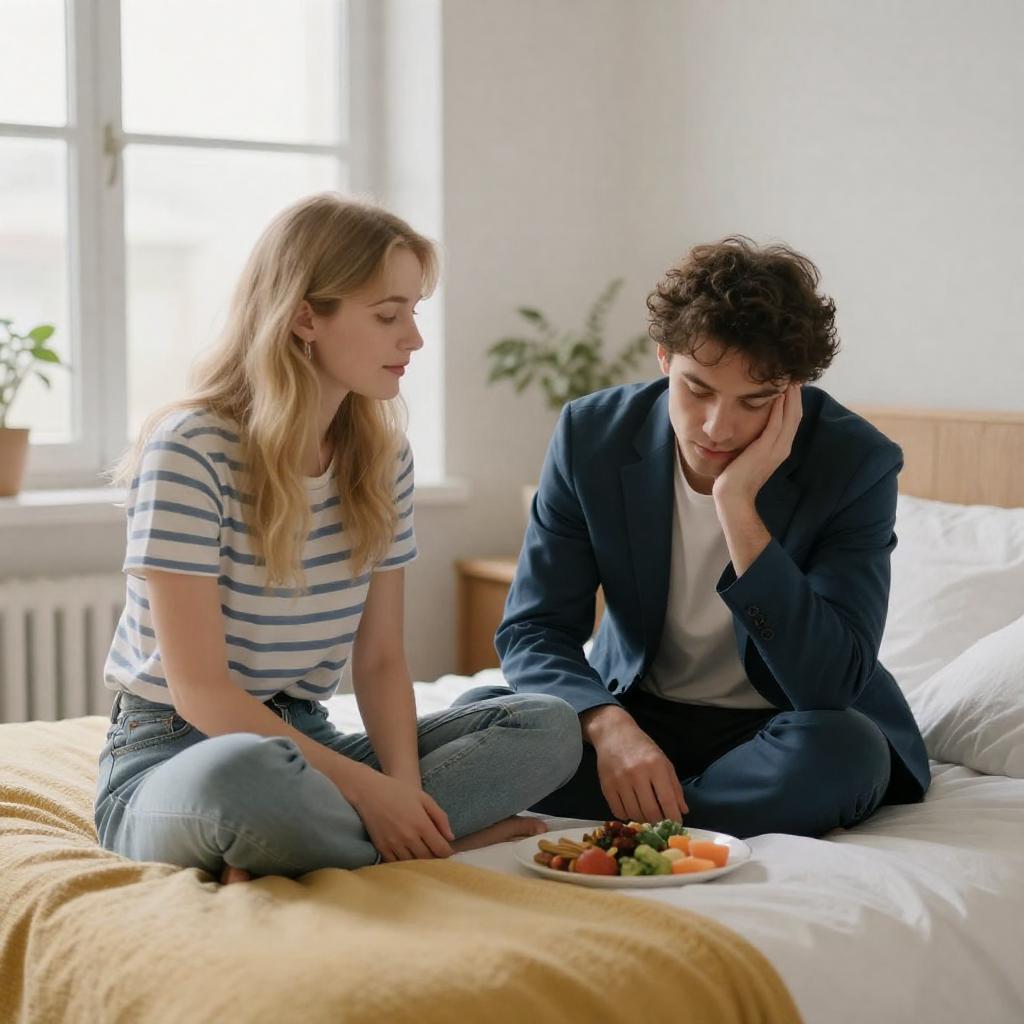 Photograph of a bedroom scene: a blonde woman in a striped shirt sits cross-legged on a bed next to a dark-haired man in a blue suit, who is resting his head on his hand, looking down at a plate of food. A yellow blanket covers part of the bed. Background includes a window with light and a green plant.