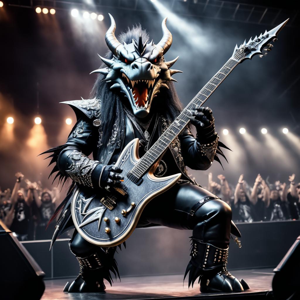 Anthropomorphic dragon dressed as a heavy metal rock star, playing guitar on stage before a headbanging crowd, dark and photorealistic.