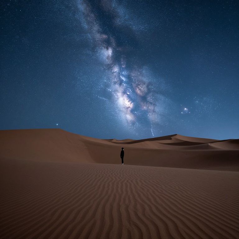 A solitary figure stands amidst vast, rippling sand dunes under a mesmerizing night sky, where the Milky Way cascades like a celestial river, evoking a surreal, otherworldly atmosphere reminiscent of a high-definition digital art rendering.