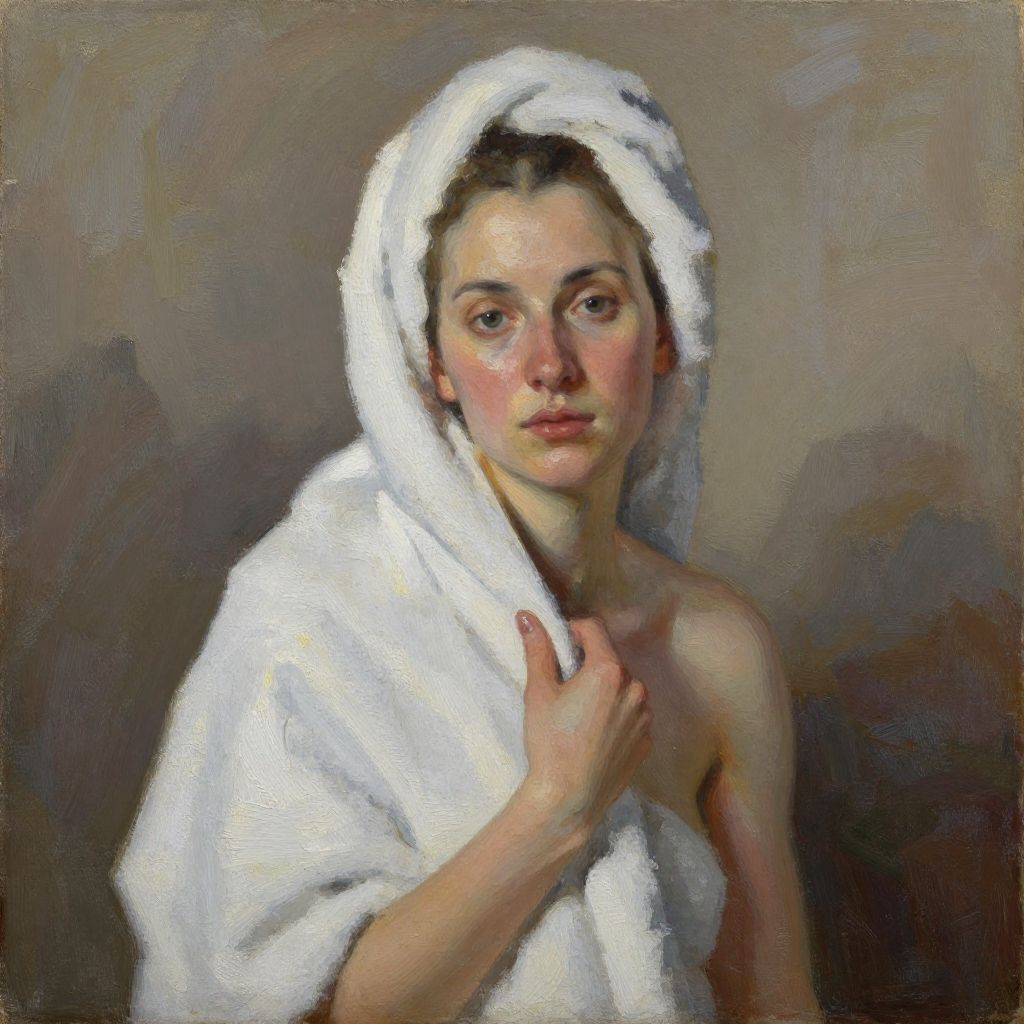 Oil painting of a fair-skinned woman with a white towel wrapped around her head, covering her shoulders, looking directly at the viewer.