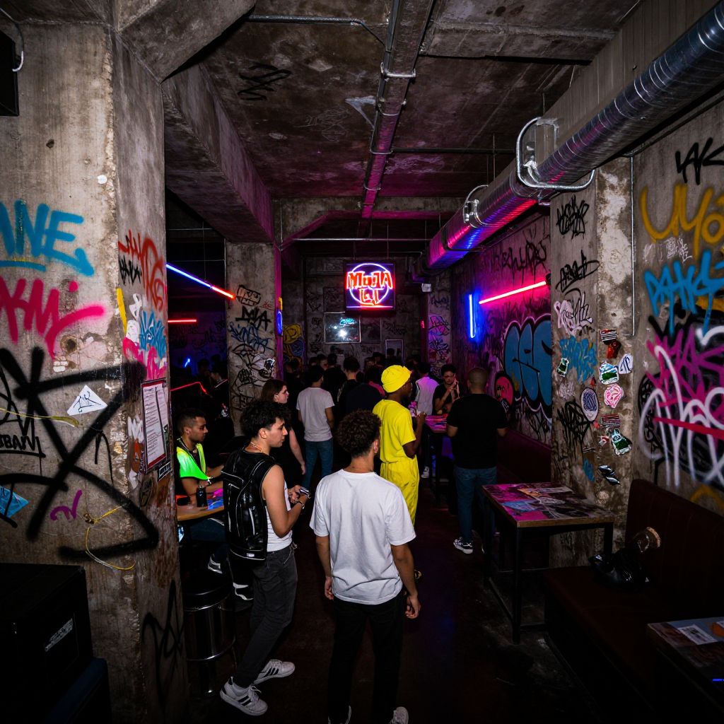 A high-contrast photo of an underground nightclub interior, where neon lights flicker across walls covered in graffiti, concrete, leather, and synthetic materials, creating a riot of textures and bold visual noise—dark corners, glowing signs, and people in bold costumes adding to the chaotic atmosphere.