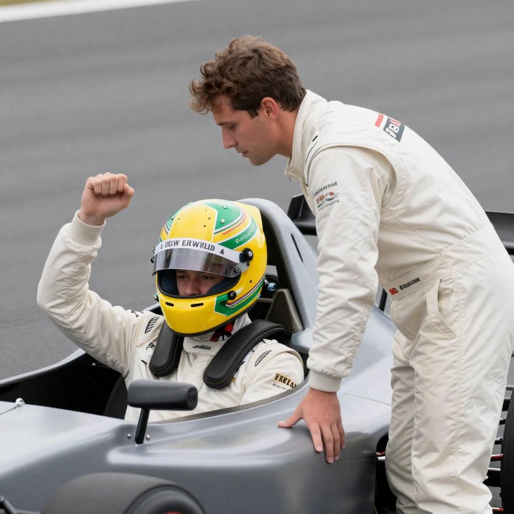 Photograph of two male race car drivers in red racing jackets with white trim, standing against a red and white background. The driver on the left has blond hair, holds a black helmet in his right hand, and gazes forward. The driver on the right has brown hair, looks over his shoulder, and wears a checkered racing patch on his jacket. Both wear multiple sponsor patches.