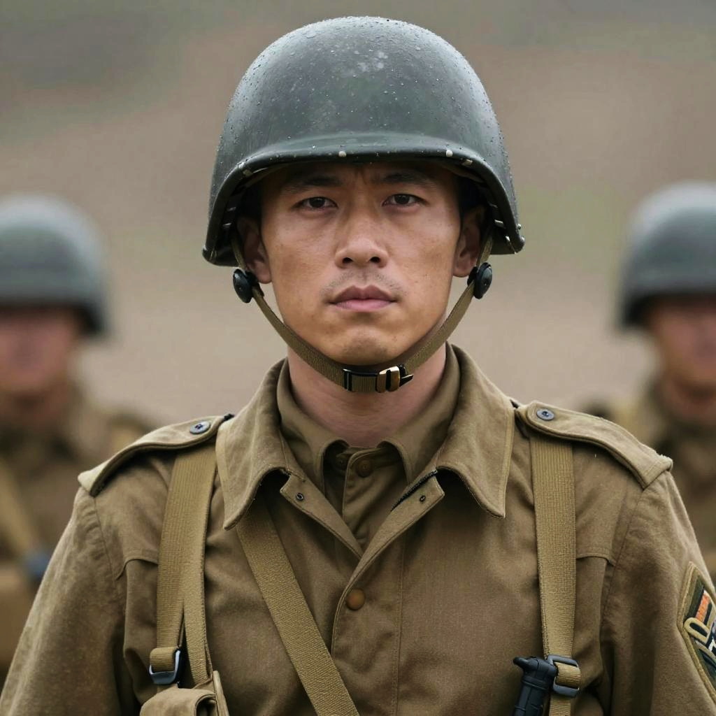 Photograph of a serious Asian male soldier in World War II-era uniform, black helmet, brown shirt, and strap, with blurred background soldiers.