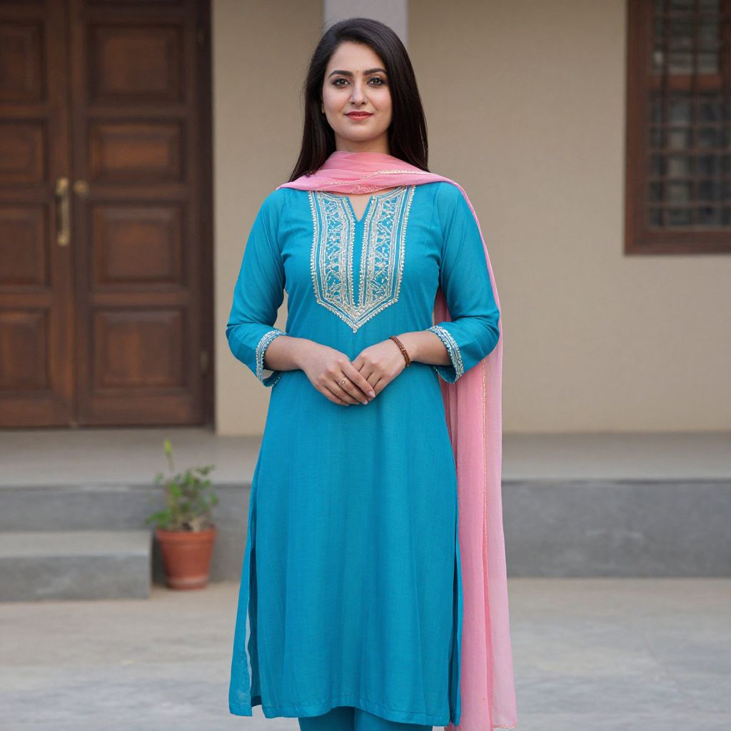 Salwar Suit Design Costume, a woman in a blue dress and pink scarf standing outside