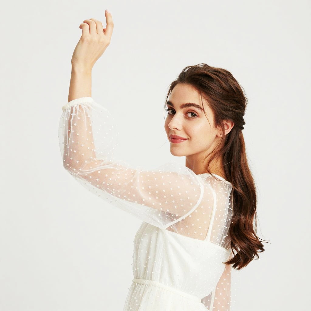 Photograph of a beautiful woman with fair skin and long brown hair, styled in a loose side braid. She's wearing a sheer, white polka-dot dress with puffed sleeves, looking over her shoulder with a slight, confident smile. The bright, white background makes her stand out, and she's raising one arm gracefully, adding a sense of movement to the image.