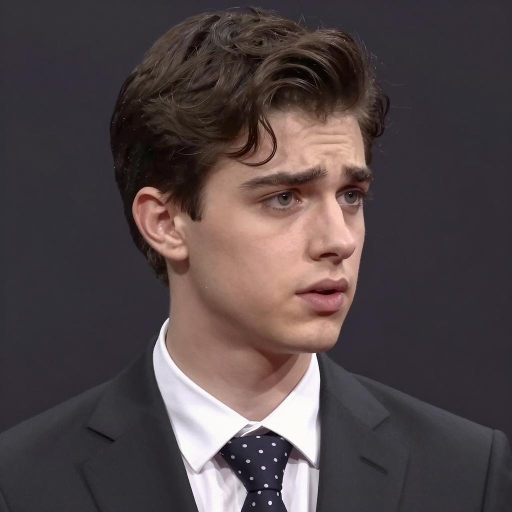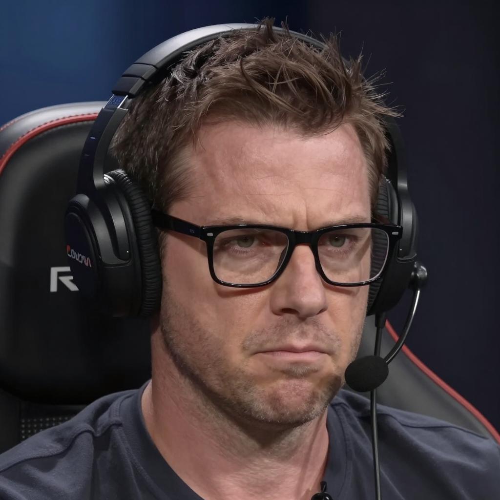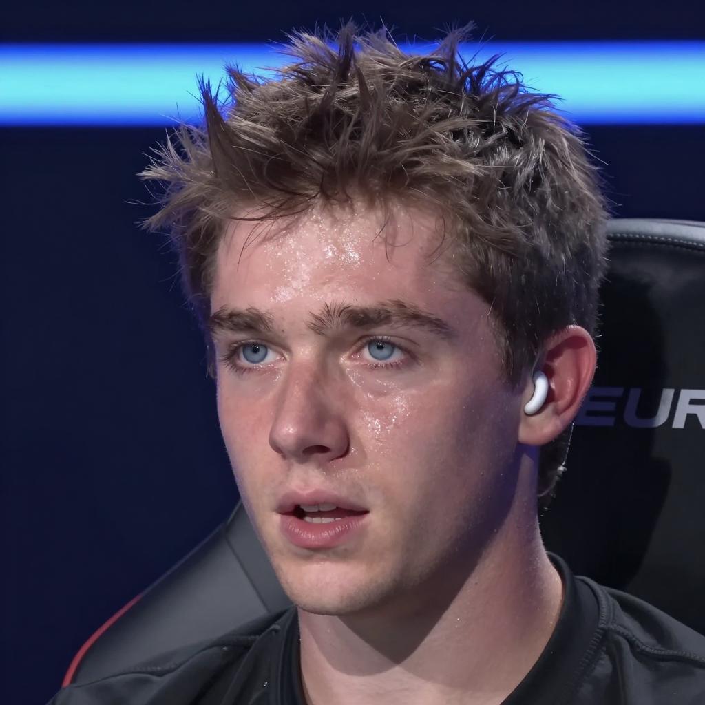 Close-up photograph of a young man with short, messy brown hair, blue eyes, and a slightly open mouth. He has sweat on his face and wears a black shirt. A white headset is on his right ear. Blue neon lights in the blurred background. His expression is intense and focused.