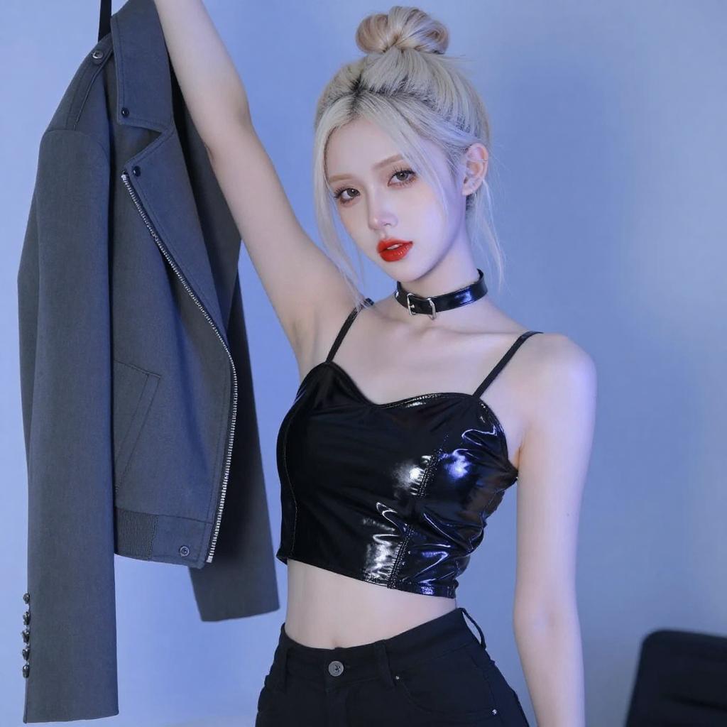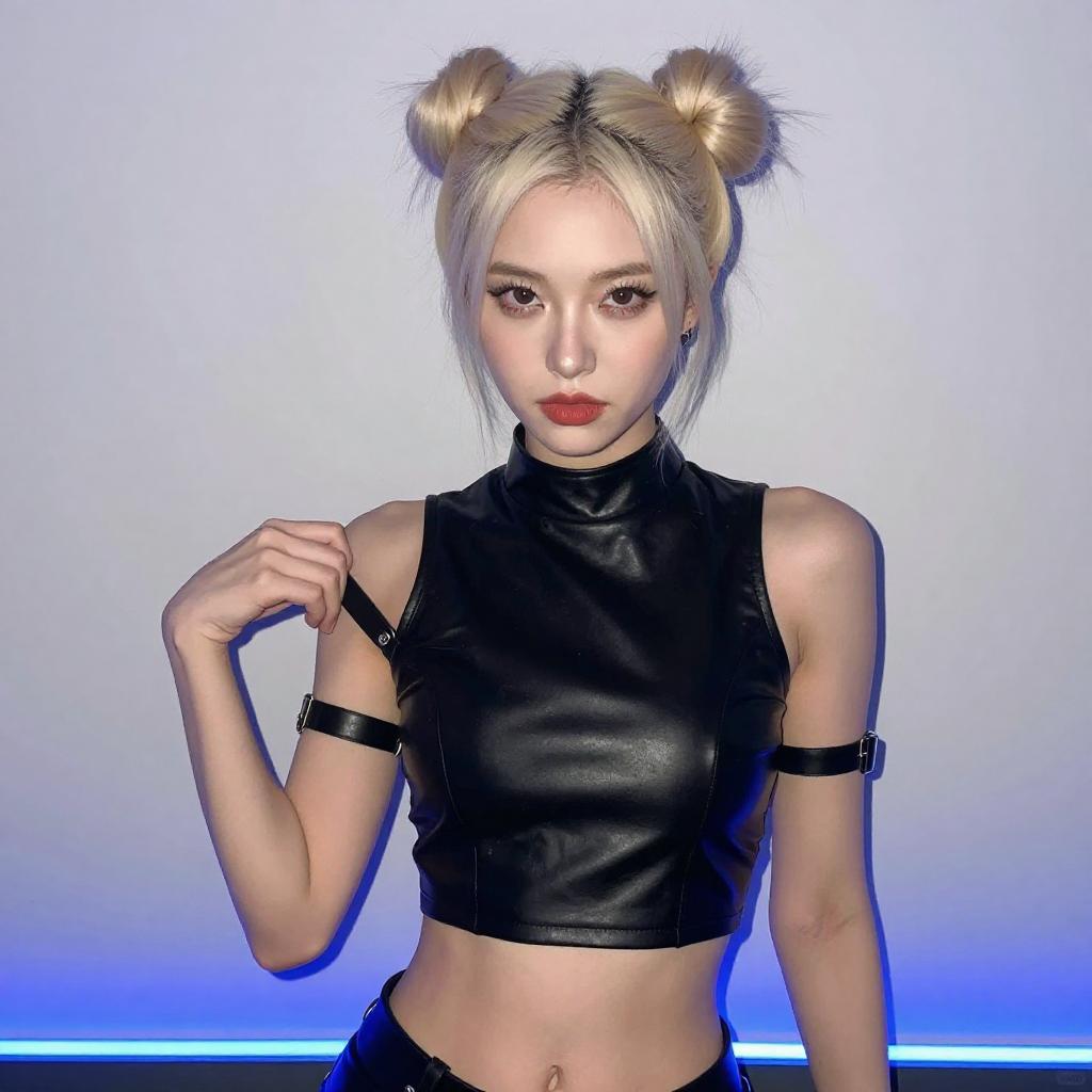 Photograph of a pale-skinned, young woman with platinum blonde hair styled in two buns, wearing a black and silver, off-shoulder, leather-like top. She has blue eyeshadow, red lipstick, and is touching her face with her right hand. The background is a plain, white wall with a blue light strip at the bottom.