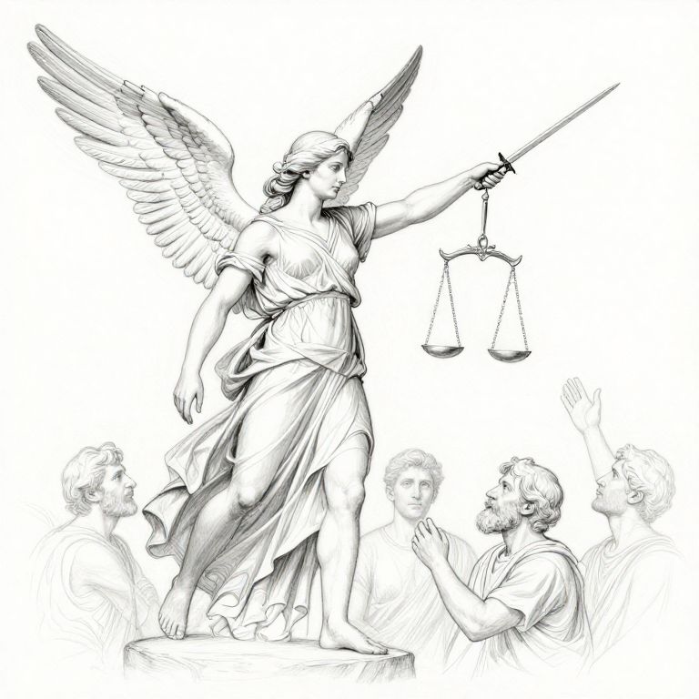 Black and white sketch of an angelic woman with wings and a sword, holding scales, standing over kneeling, admiring men.