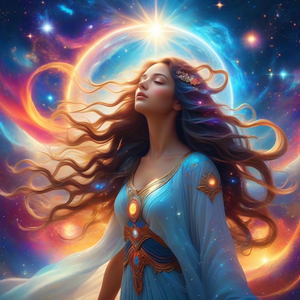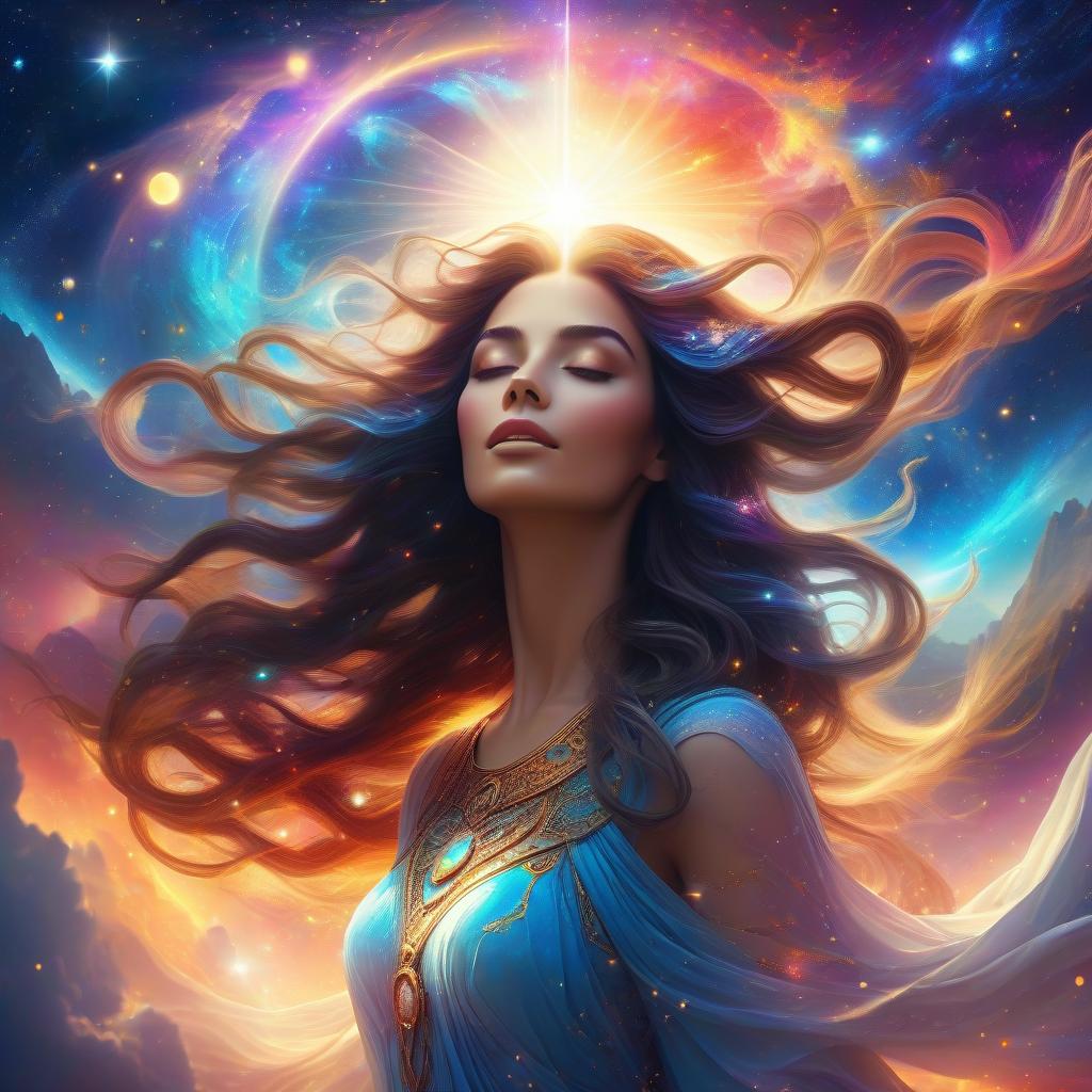 A super beautiful woman resembling a goddess with flowing hair, surrounded by celestial bodies and radiant light, in a divine, heavenly landscape, style of transcendental bliss, hyper-detailed, colorful, mind-expanding aesthetic