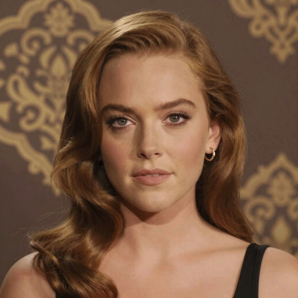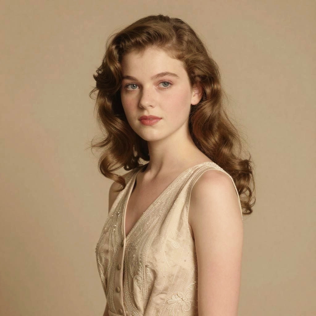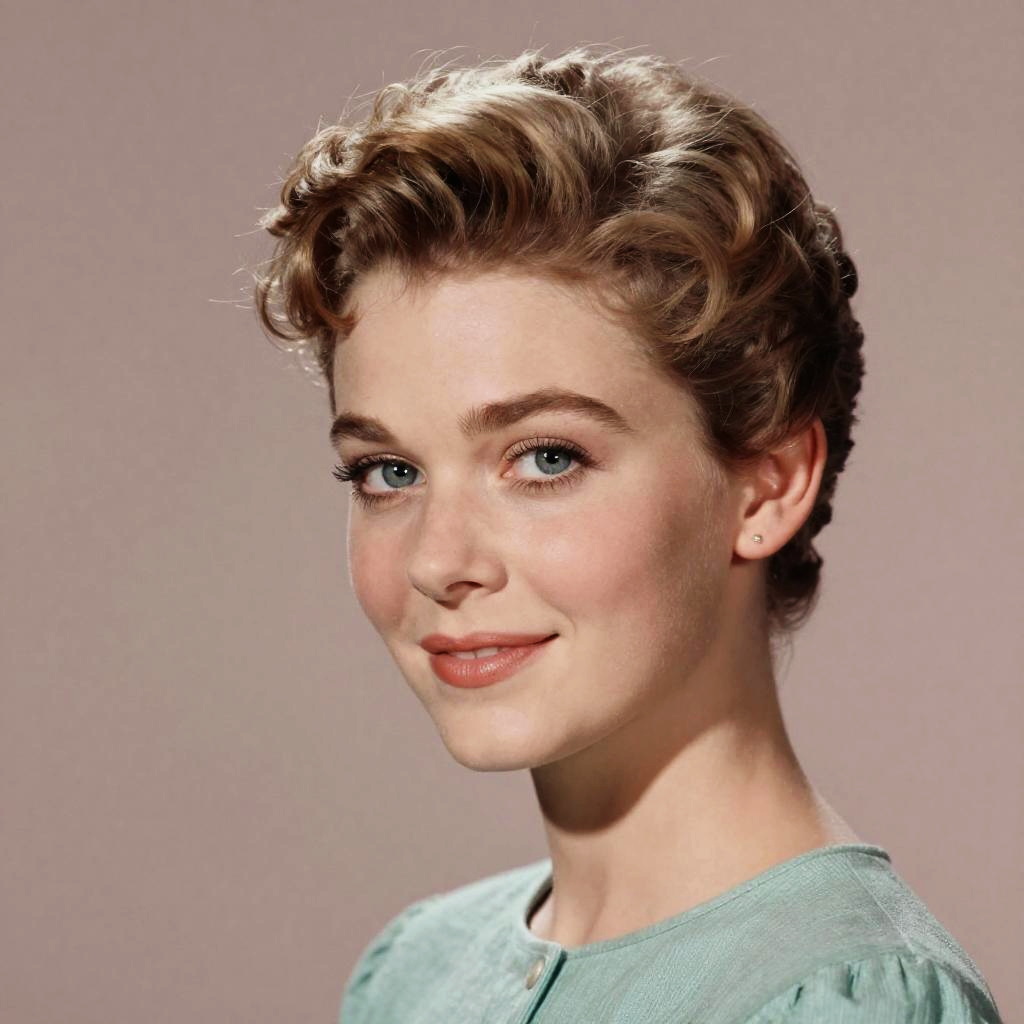 Detailed young Patsy Kensit portrait, soft-focus lens, classic 80s pastel tones, elegant mood, subtle smile, studio photography style, textured background