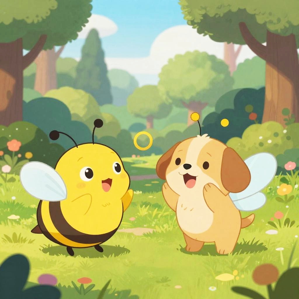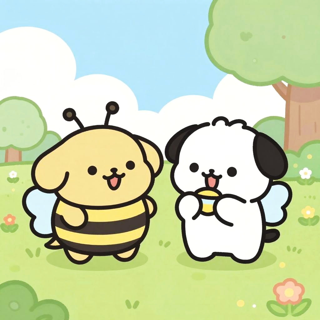 Is bee and puppycat kids-friendly character design, simple shapes with big eyes, lively poses against a candy-colored background, happy and inviting atmosphere
