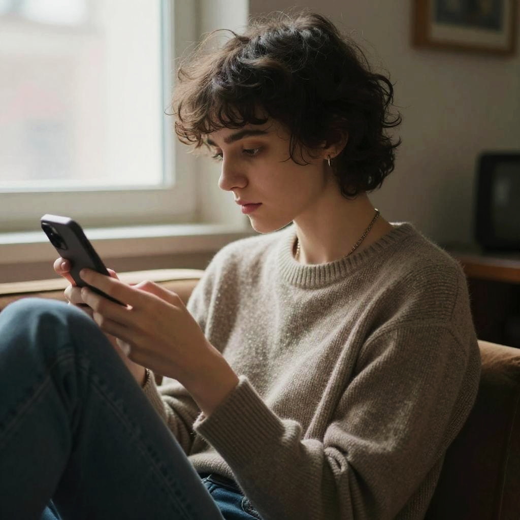 Photograph of a young woman with short, curly black hair and fair skin, sitting on a brown couch in a dimly lit room. She is wearing a light beige knitted sweater and blue jeans, focusing intently on a black smartphone she holds with both hands. Soft sunlight filters through a nearby window, casting a gentle glow on her face. A small, framed picture is visible on the white wall in the background, and a dark television set is partially seen to the right. The overall mood is calm and introspective.