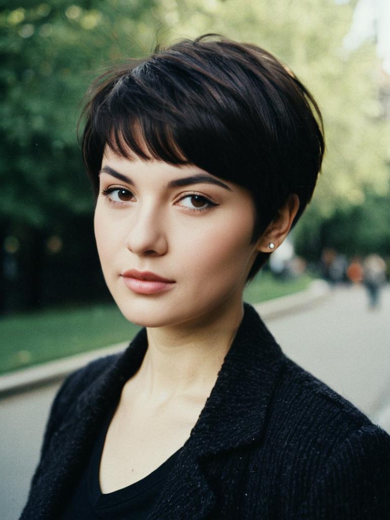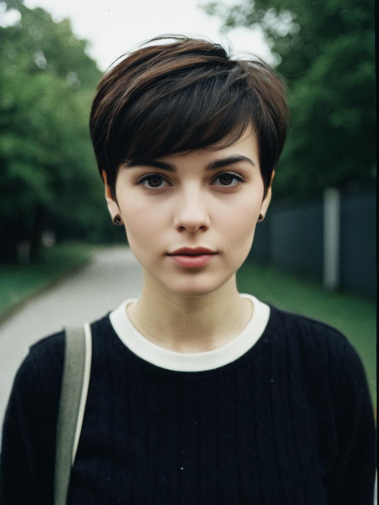 Woman with Dark Brown Pixie Cut, candid fashion portrait outdoors