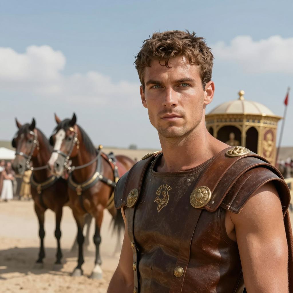 Two muscular men in ancient Roman-style clothing. The man on the left wears a metallic helmet with colorful feathers, silver shoulder armor, and looks up at the other man. The man on the right is shirtless, wearing a dark loincloth and gold arm bands, leaning forward slightly. White draped fabric in the background. Both men have light skin and short dark hair. Two other partially visible men in similar attire are on the left and right edges.