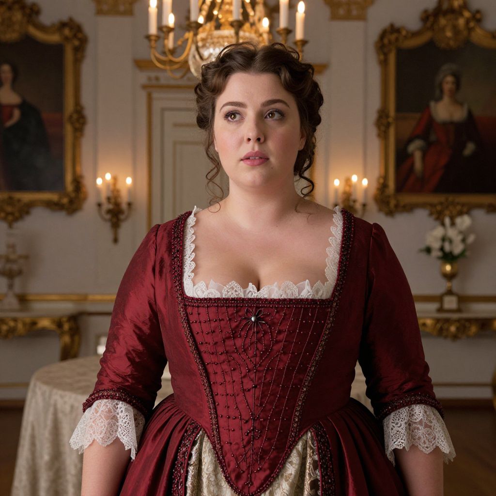 Photograph of a fair-skinned woman with curly dark brown hair, wearing a Victorian-era maroon dress with white lace trim and a corseted bodice, seated in an ornately decorated room. The dress has puffed sleeves and a square neckline. She has a serious expression, with slightly parted lips and dark eyebrows. The background features an opulent chandelier, golden wall sconces with lit candles, and framed portraits. A round table with a white cloth is partially visible behind her. The room has a luxurious, historical ambiance, with rich textures and warm lighting.