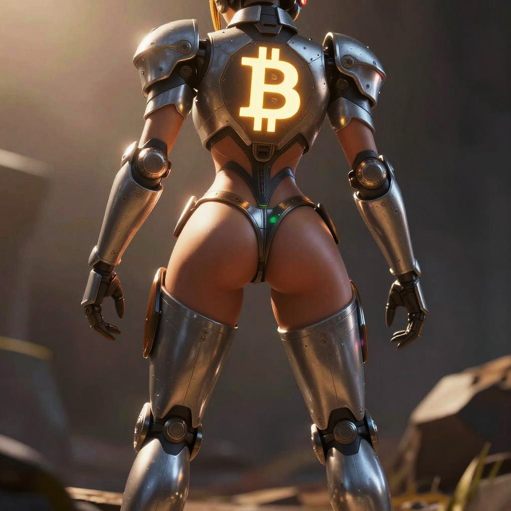 Back view of Samus Aran from Metroid, with hyper-real shiny skin on midriff, thighs, and calves, Bitcoin logo on back. Photorealistic fantasy style with backlighting, rim light, silhouette, intricate details, smooth fine art rendering, 8k octane, 70mm lens, cinematic lighting.
