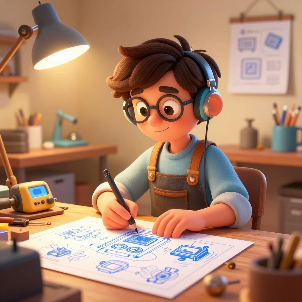 AI image cartoon of a young inventor designing AI-powered gadgets in a cozy workshop filled with quirky tools and animated blueprints, warm lighting, hand-drawn textures, and charming character design emphasizing creativity and innovation.