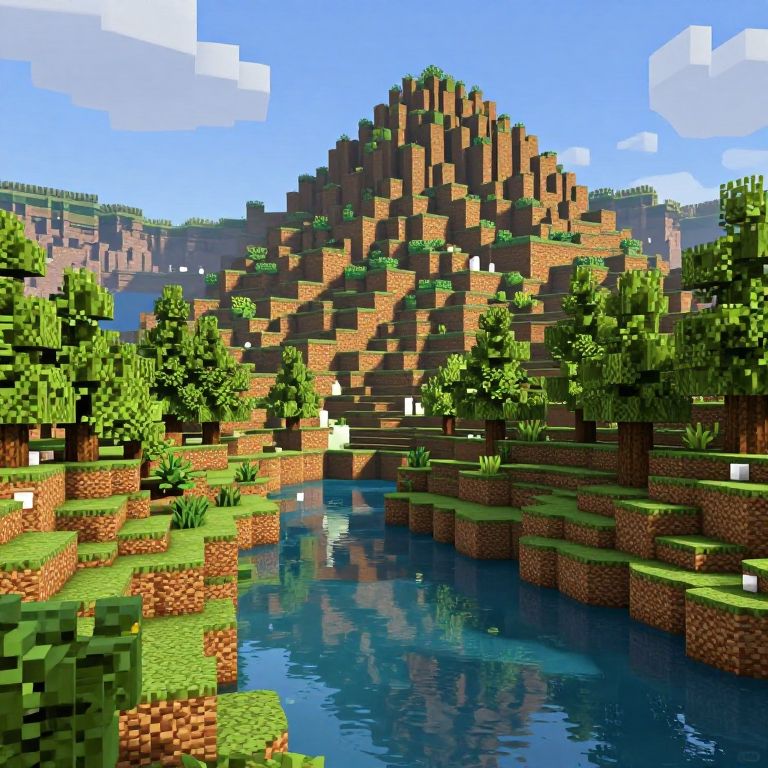 This is a digital pixel art image in the style of Minecraft, featuring a large, pyramid-like structure made of brown, blocky stones with green foliage on top, set against a bright blue sky with white clouds. In the foreground, there is a reflective blue river with grassy, blocky platforms on both sides. The platforms have small white windows and are surrounded by green trees and plants. The overall scene is vibrant with clear, defined pixel shapes and a sunny, outdoor setting.
