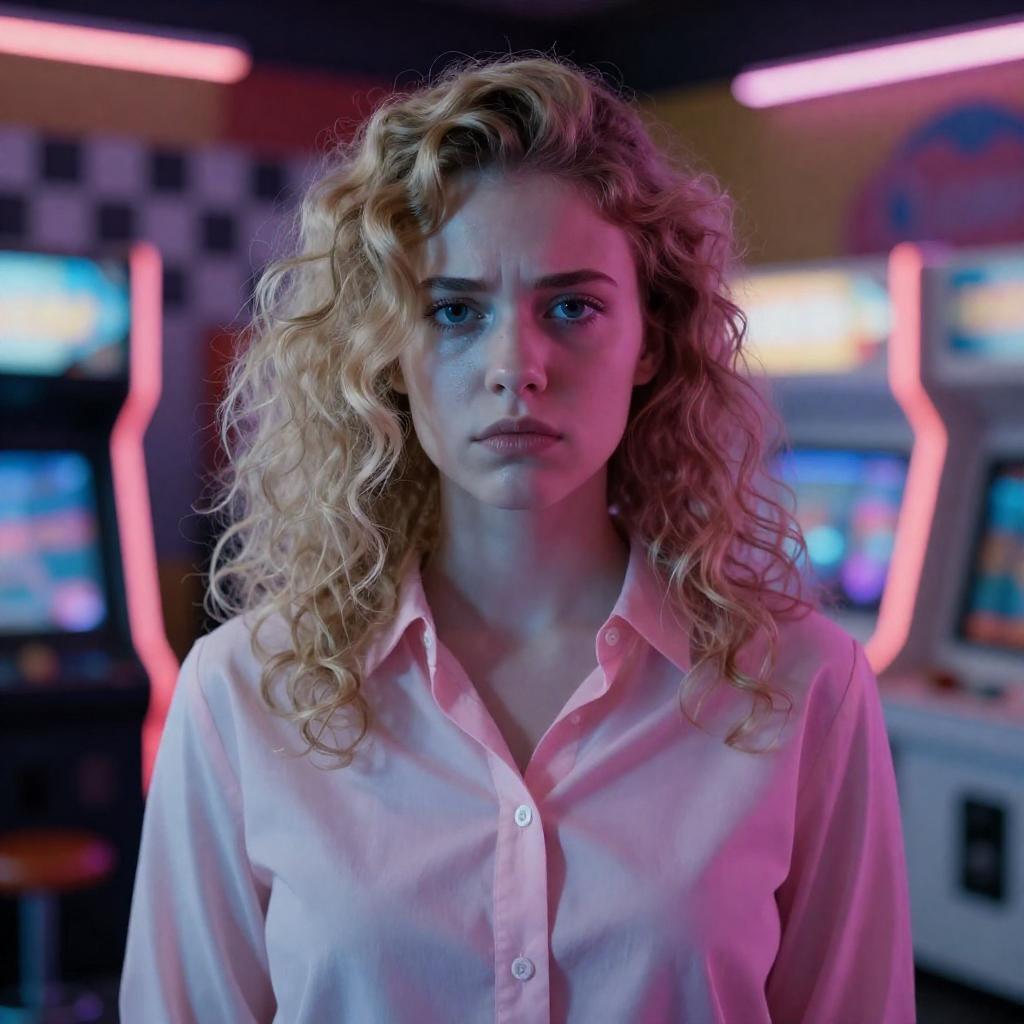 Photograph of a young woman with curly blonde hair, wearing a pink button-up shirt, standing in a neon-lit, retro-style arcade. Her expression is serious, with a slight frown. The background features colorful, illuminated signs and a checkered wall. The lighting casts a blue and pink hue on her face.
