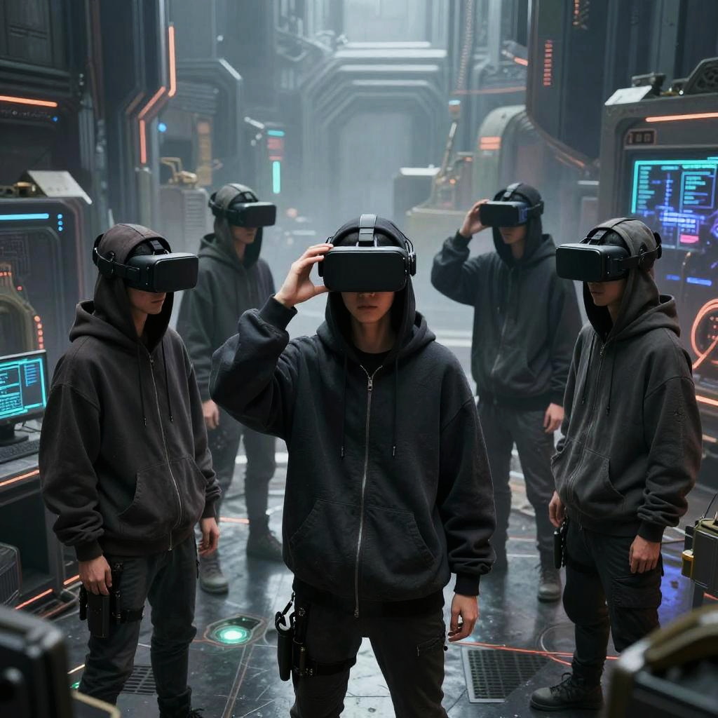 Photorealistic CGI image of five men in a futuristic, dimly lit corridor with neon lights. They wear black hooded sweatshirts, black pants, and black VR headsets. The men stand in a semi-circle, with one adjusting his headset. The corridor features glowing blue and orange screens, metallic walls, and a wet, reflective floor. The background shows a misty, illuminated hallway stretching into the distance, enhancing the sci-fi atmosphere. The men's expressions are obscured by their headsets, adding an air of mystery and focus to the scene.
