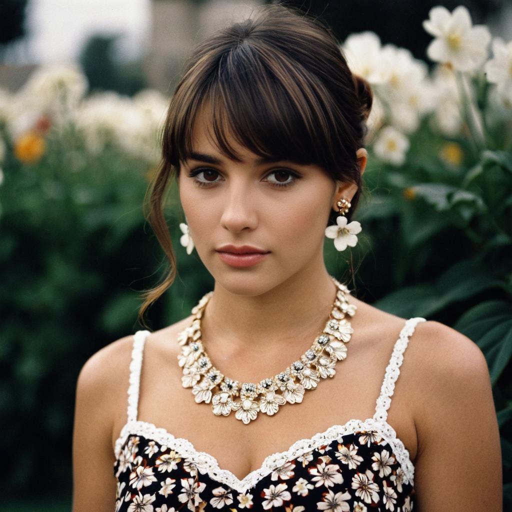 Close-up portrait of a young woman with brown hair styled with a pearl headband, wearing large ornate pearl earrings and a matching necklace. She is dressed in a white sleeveless dress adorned with golden bead embellishments. The outdoor background is blurred, emphasizing her face and upper body during daytime.
