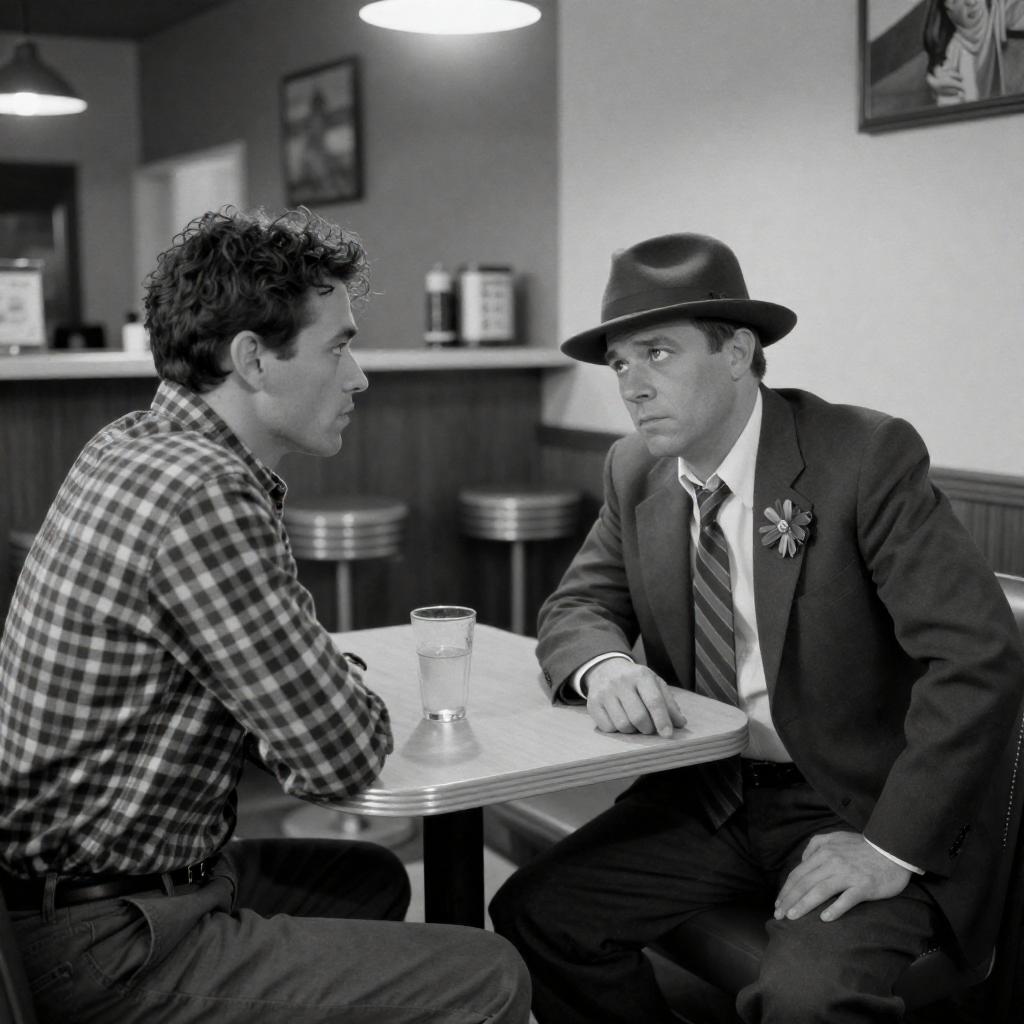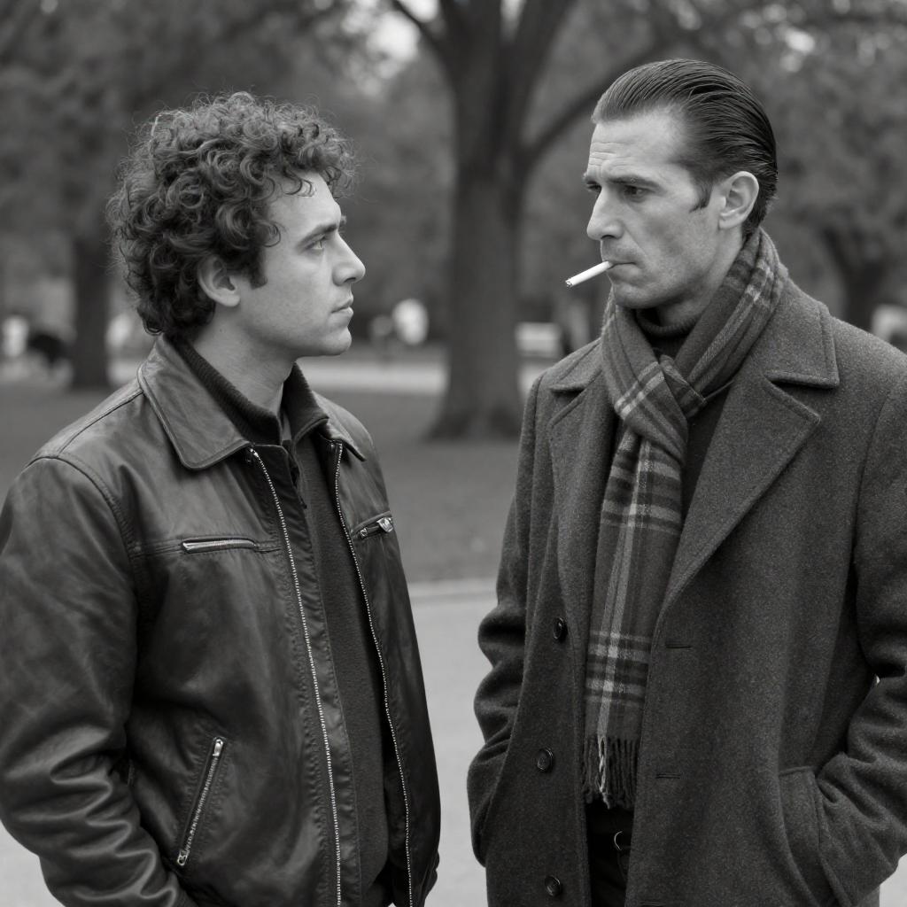 Black-and-white photograph of two men in an outdoor park. The man on the left has curly hair, wears a leather jacket, looks to the right with a neutral expression. The man on the right has slicked-back hair, wears a ured coat and plaid scarf, has a cigarette in his mouth, looks to the left with a serious expression. Trees in the background. Both men stand close, facing each other.