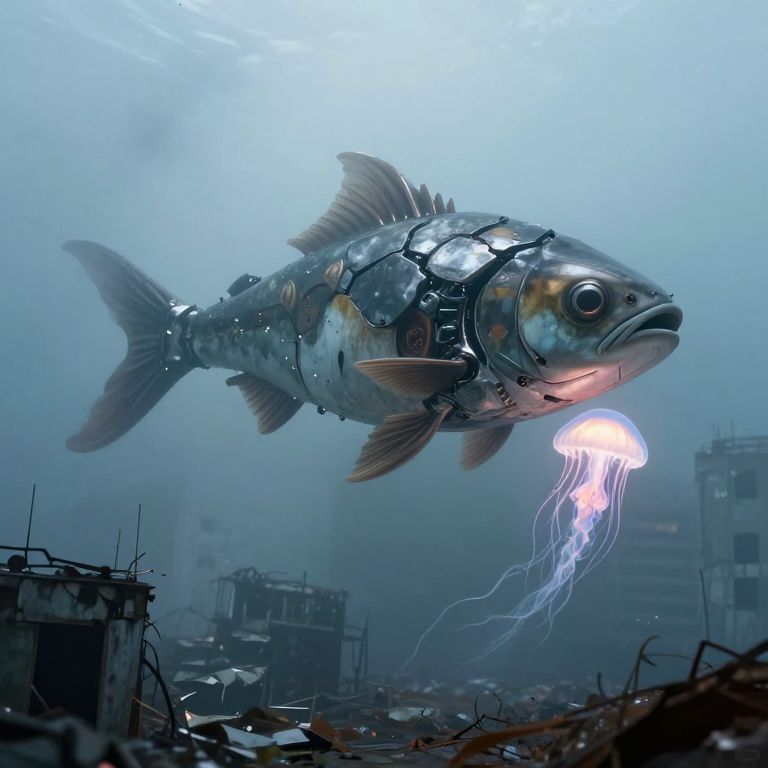 Photograph of a cybernetic fish with metallic armor, glowing eyes, and a jellyfish-like tail, floating in a foggy, underwater urban