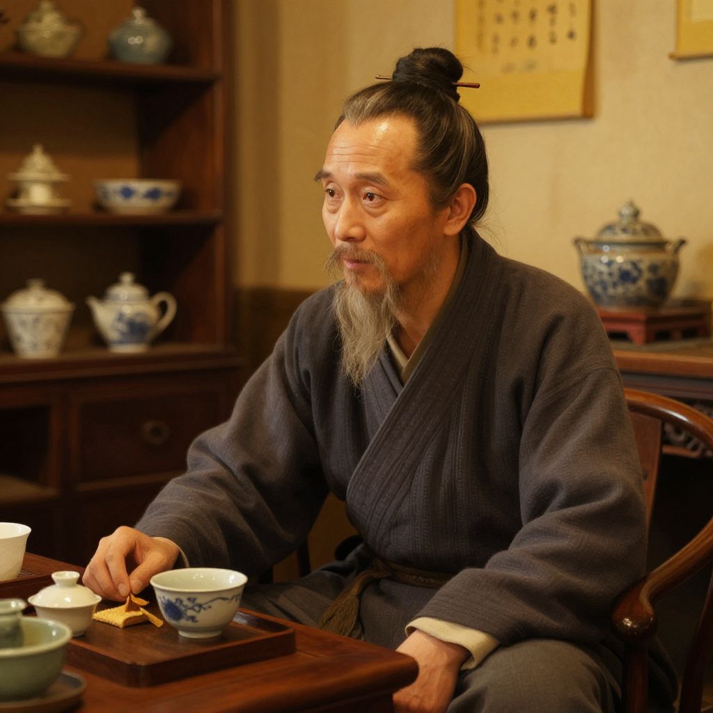 Old Asian man with beard in cozy traditional tea house, surrounded by antique pottery and wooden furniture, warm ambient lighting, intricate beard details, painterly effect