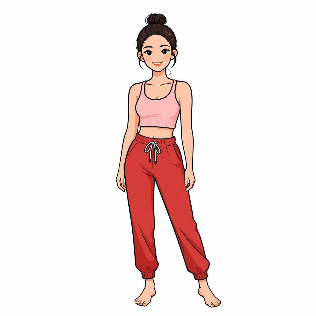 This is a digital illustration of a young woman standing against a plain white background. She has fair skin, black hair tied in a bun, and large, expressive eyes with dark eyebrows. She wears a pink, ribbed, sleeveless crop top that reveals a small portion of her midriff, and loose, red, drawstring pants that sit just above her ankles, showing her bare feet. Her arms hang naturally by her sides, and she has a slight, confident smile on her face. The illustration uses bold, clean lines and a bright, flat color palette, typical of modern digital cartoon styles.