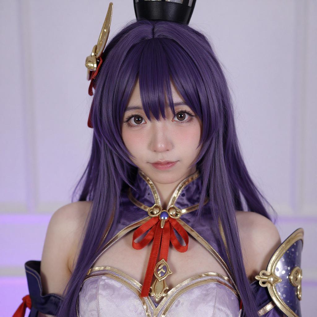 Photograph of an Asian woman with long, vibrant purple hair, wearing a black headband and a blue and white cosplay outfit. She has fair skin, pinkish-red eyes, and red lipstick. Her hands are gently touching her chin, with a white blouse featuring ruffled sleeves. The background is a plain white wall.