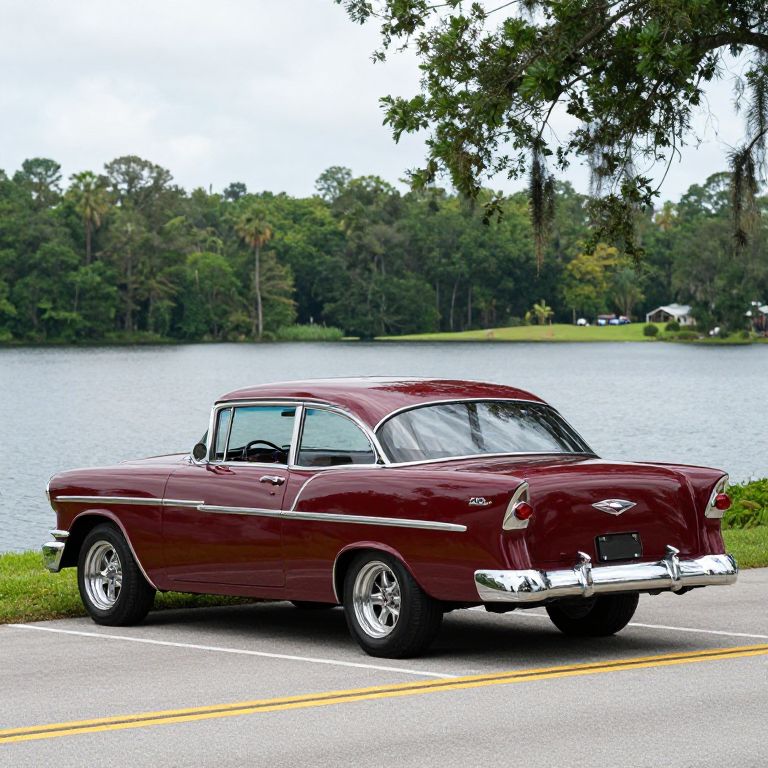 Shiny maroon 1956 Chevrolet Bel Air (CC-1297377), featuring chrome accents and classic styling, is parked gracefully along a scenic road near a tranquil lake in Lakeland, Florida, showcasing its vintage charm against a backdrop of lush greenery and calm waters.