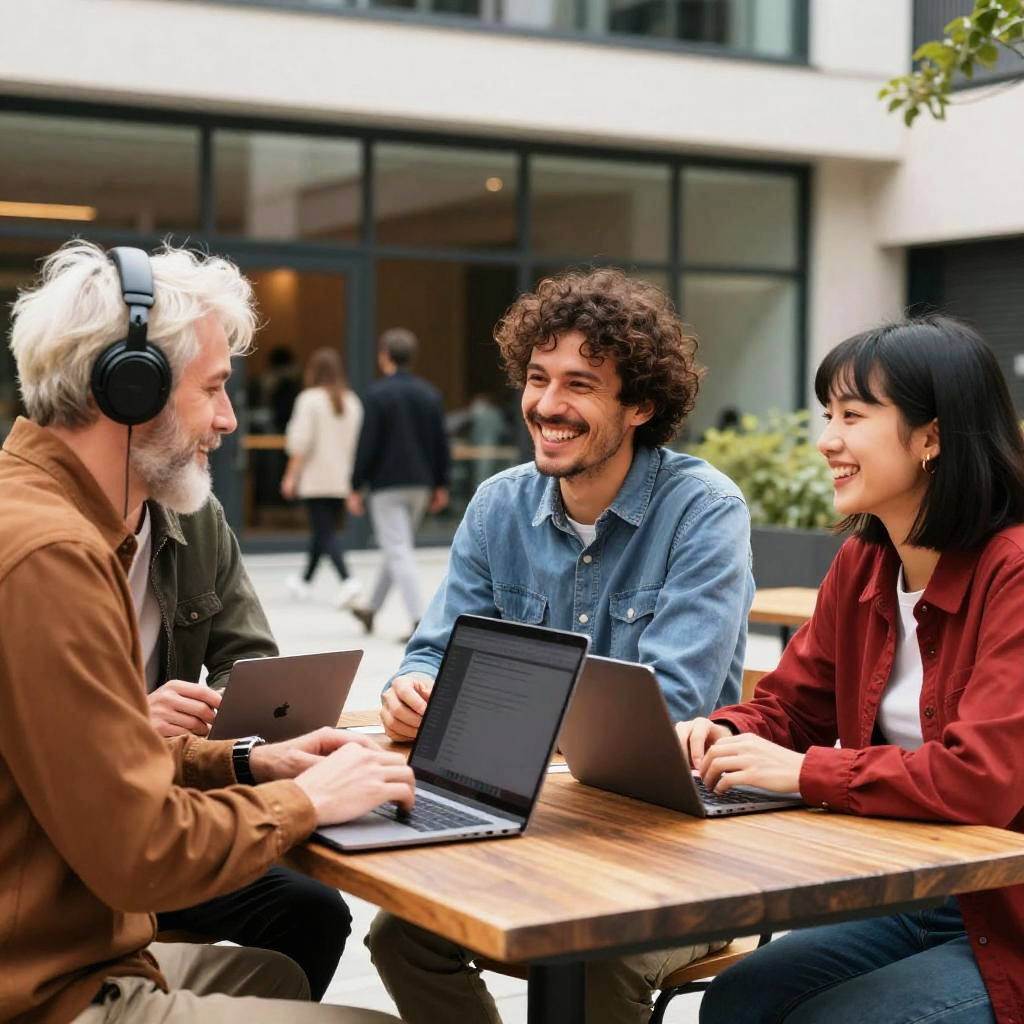 Photograph of a smiling young woman with curly brown hair and medium brown skin, wearing red headphones and a bright orange shirt. She's sitting at an outdoor table, focused on a silver laptop. The background is a sunny, urban street with greenery and blurred buildings. On the table, there's a yellow drink, a black phone, and some papers. She's radiating happiness and concentration.
