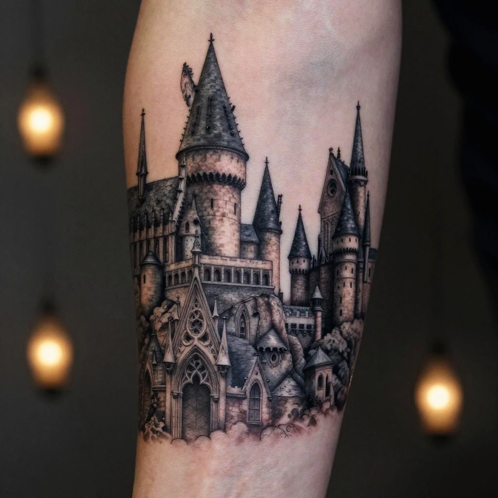 Realistic Hogwarts castle tattoo on back, ultra-detailed stone carvings and pointed spires, subtle smoke and magical sparkles emanating from windows, fine linework with smooth gradient shadows, classic monochrome style with focus on architectural realism.