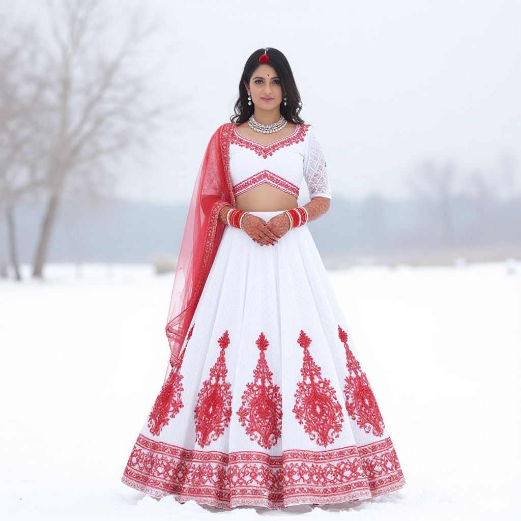 Photograph of a South Asian woman with fair skin and long black hair, wearing a traditional white and red lehenga choli. The outfit features a white cropped top with lace sleeves and red geometric patterns, paired with a full-length white skirt adorned with red floral designs and a red lace hem. She has a red dupatta draped over her shoulder, red bangles, and a pearl necklace. Her makeup includes red lipstick and subtle eye shadow. The background is a blurred, wintry landscape with bare trees. The overall style is elegant and festive.