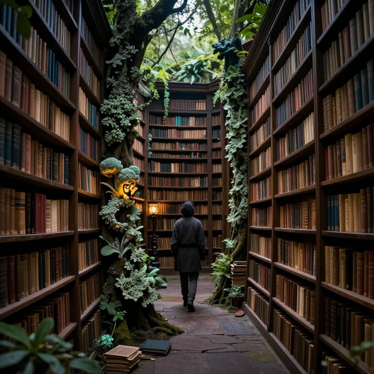 In a mystical library where ancient wisdom intertwines with nature’s embrace, glowing lichens and whispering books create a sacred sanctuary of contemplation, inviting the soul to wander through the timeless corridors of knowledge and wonder.